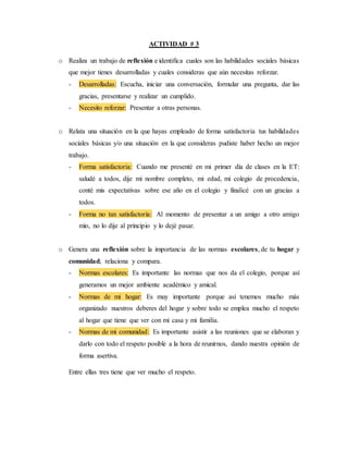 El documento resume las habilidades sociales del autor, identificando aquellas que domina como escuchar y presentarse, y la que necesita mejorar que es presentar a otras personas. Relata dos situaciones, una donde uso satisfactoriamente sus habilidades al presentarse en clases y otra donde pudo haber hecho un mejor trabajo al presentar a un amigo. También habla sobre la importancia de las normas escolares, del hogar y de la comunidad, centrándose en el respeto. Finalmente, establece un compromiso para mejorar su organización y habilidad para presentar amigos