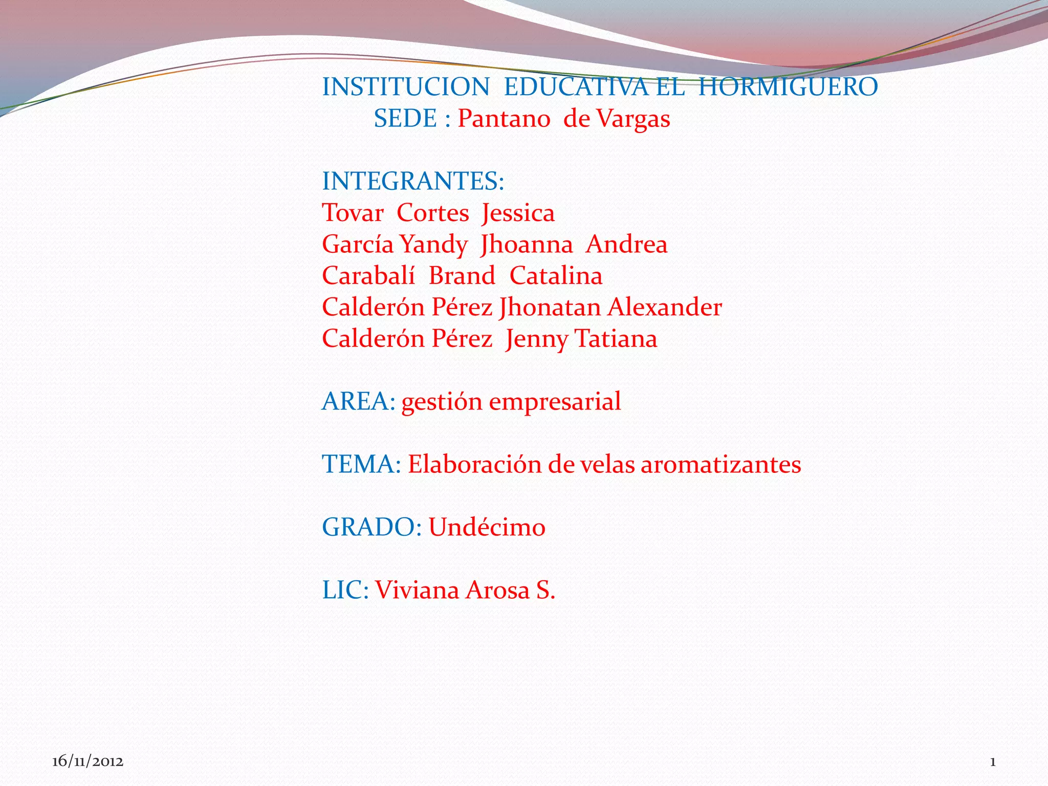 Este documento presenta un proyecto de estudiantes del grado 11mo sobre la elaboración de velas aromatizadas. Explica los materiales necesarios como parafina, aromas, pabilos y moldes. Detalla el proceso de derretir la parafina, agregar color y aroma, y depositar la mezcla en los moldes para que se solidifique en velas aromatizadas.