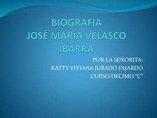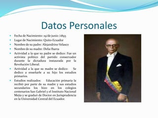 Este documento proporciona una biografía detallada de José María Velasco Ibarra, un político ecuatoriano que fue presidente del Ecuador en cinco ocasiones no consecutivas entre 1934 y 1972. Detalla sus orígenes familiares, educación, carrera política temprana, y describe sus logros y dificultades durante cada uno de sus períodos presidenciales, incluidos proyectos de infraestructura, obras públicas y conflictos que llevaron a su derrocamiento en varias ocasiones. Velasco Ibarra gobernó casi 13 años