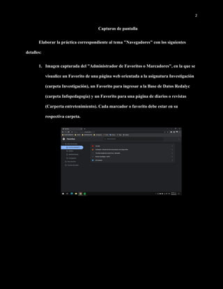 Este documento presenta las instrucciones para una práctica sobre navegadores. Pide capturas de pantalla del administrador de favoritos con marcadores en carpetas de Investigación, Infopedagogía y Entretenimiento. También solicita capturas de la biblioteca My Library de Diigo con recursos sobre calentamiento global, de My Outliners con una lista sobre el tema, y de la creación de un equipo de trabajo con dos integrantes. Por último, pide una captura de búsqueda de la palabra "contaminación" en una página sobre calentamiento global
