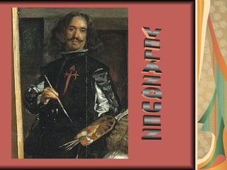 Diego Velázquez (1599-1660) fue un pintor barroco español considerado uno de los máximos exponentes de la pintura española. Sus obras se caracterizaron por un estilo naturalista con iluminación tenebrista, pinceladas rápidas y sueltas, y en su última década su estilo se hizo más esquemático. Algunas de sus obras más famosas incluyen La rendición de Breda, Retrato del papa Inocencio X, Las meninas y La venus del espejo.