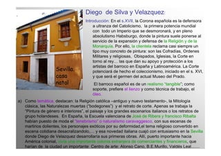 Este documento resume la vida y obra del pintor barroco español Diego de Silva y Velázquez (1599-1660). Tras formarse en Sevilla, Velázquez se trasladó a Madrid en 1623 donde fue nombrado pintor de la corte real. Algunas de sus obras más destacadas de su primera etapa en Sevilla incluyen La vieja friendo huevos, El aguador de Sevilla y La mulata, caracterizadas por su realismo, uso de la luz tenebrista y detalles en los bodegones. Veláz