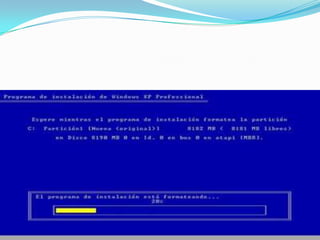 El documento proporciona instrucciones para instalar Windows XP desde un CD de instalación. Incluye pasos como iniciar desde el CD, particionar y formatear el disco duro, instalar Windows en la partición creada, introducir la clave de producto, configurar la conexión de red y de Internet, y completar la instalación para acceder al escritorio de Windows.
