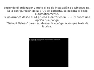 Este documento proporciona instrucciones paso a paso para instalar Windows XP en un ordenador, incluyendo iniciar la instalación desde el CD, particionar y formatear el disco duro, completar la instalación, configurar la conexión a Internet y crear cuentas de usuario.