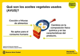 Este documento describe la regulación y gestión de los aceites vegetales usados (AVUS) en la Ciudad Autónoma de Buenos Aires. Explica que los AVUS pueden causar impactos ambientales si no se gestionan adecuadamente y representan riesgos para la salud. Detalla los posibles destinos de los AVUS en la ciudad, así como los sujetos alcanzados por la regulación y los objetivos de prevenir la contaminación y promover el reciclado de AVUS. Además, explica el registro obligatorio de generadores, transportistas y operadores de AVUS y los requ