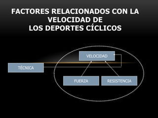 La velocidad se define como la relación entre la distancia recorrida y el tiempo empleado, y depende de factores como la fuerza, resistencia y técnica. Existen diferentes manifestaciones de la velocidad como la rapidez de movimientos aislados o la velocidad de movimientos continuados, y se clasifica según si hay cargas externas o no y si el movimiento es acíclico o cíclico. La velocidad pasa por cuatro fases: reacción, aceleración, máxima velocidad y pérdida de velocidad.