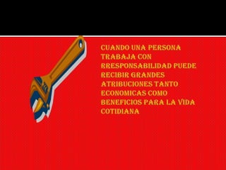 El documento describe la importancia del valor de la responsabilidad en la vida cotidiana. Ser responsable permite alcanzar objetivos y tener éxito en distintos aspectos de la vida, mientras que la irresponsabilidad puede conducir a perder oportunidades y vivir en la pobreza. La responsabilidad es clave para salir adelante.