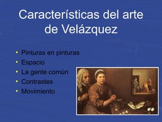 Este documento resume la vida y obra del pintor español Diego Velázquez. Se destacan sus características pictóricas como pinturas dentro de pinturas y el uso del espacio. Velázquez se especializó en retratos reales, bodegones, temas religiosos y mitológicos donde representó gente común de manera realista. Su obra más famosa es Las Meninas que analiza la perspectiva y jerarquía en la corte real.