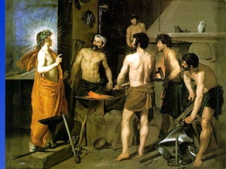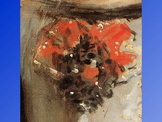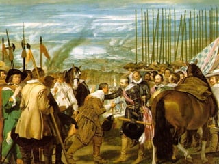El documento resume la carrera artística del pintor español Diego Velázquez, dividiéndola en etapas en Sevilla, Madrid e Italia. Destaca obras tempranas como La Adoración de los Reyes y Cristo en casa de Marta y María, y su trabajo como retratista de la corte española, incluyendo retratos de los reyes Felipe III, Felipe IV e Isabel de Borbón. También menciona sus dos viajes a Italia y obras allí como El papa Inocencio X, así como obras posteriores en