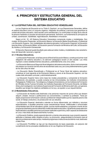 El documento describe la estructura y objetivos generales del sistema educativo de Venezuela. Se explica que consta de niveles educativos como preescolar, básica, media y superior, así como modalidades como educación especial, de adultos y extraescolar. Los objetivos generales de la educación venezolana incluyen el desarrollo de la personalidad y formar ciudadanos democráticos y solidarios capaces de participar en la transformación social.