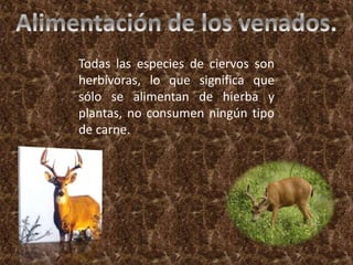 Este documento resume las características clave de los venados, incluyendo que son herbívoros y se alimentan solo de hierba y plantas, viven en una variedad de hábitats en todo el mundo como llanuras y tundra, su periodo de apareamiento es de octubre a enero, generalmente tienen pelaje marrón que les ayuda a camuflarse, y se comunican mediante gruñidos y bramidos.