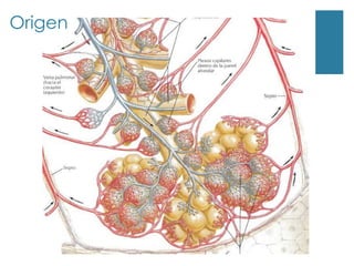 Las venas pulmonares se originan en los pulmones y se reúnen en un solo vaso que termina en la aurícula izquierda. Corren de forma transversal, horizontal u oblicua hacia abajo y adentro, estableciendo relaciones extra e intrapericárdicas, y se conectan al sistema de la vena cava a través de venas bronquiales y mediastinas sin presentar válvulas.