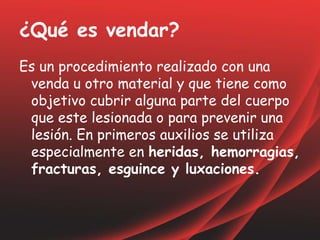 El vendaje es un procedimiento que cubre una parte del cuerpo lesionada o para prevenir lesiones. Tiene funciones como producir compresión, limitar movimiento, fijar material de curación y mantener férulas. Existen diferentes tipos de vendajes como el circular, en espiral y en ocho que se usan según la zona del cuerpo.