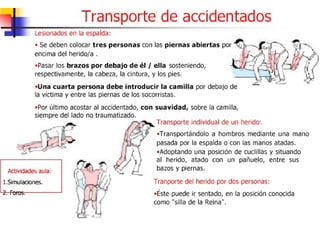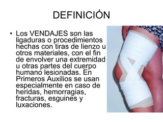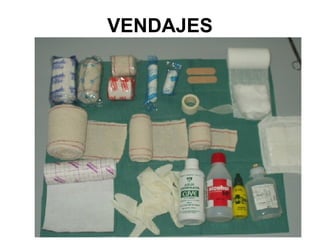 Este documento describe diferentes tipos de vendajes y quemaduras, así como los procedimientos básicos de primeros auxilios para cada uno. Explica que los vendajes se usan para sujetar apósitos, fijar entablillados y articulaciones. Detalla tipos de vendajes como el circular, espiral y en ocho, y cómo tratar quemaduras de diferentes grados enfriando la zona y cubriéndola hasta recibir atención médica.