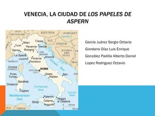 El documento proporciona información sobre la historia y características de Venecia, Italia. Venecia fue fundada en el siglo V d.C. por personas huyendo de los ataques germanos y eventualmente se independizó del Imperio Romano de Oriente. La ciudad está cruzada por numerosos canales y es conocida por sus góndolas y el Puente de los Suspiros. Lugares notables incluyen la Plaza de San Marcos, el Palacio Ducal y el Arsenal de Venecia.