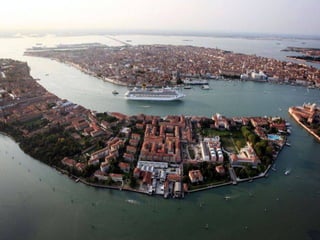 Venecia está construida sobre un archipiélago de 120 islas unidas por puentes sobre 160 canales. Aunque parece una ciudad común en el mapa, su ubicación física es más compleja dado que se encuentra sobre una laguna pantanosa conectada al mar Adriático. La ciudad enfrenta inundaciones regulares producidas por las mareas y los vientos.