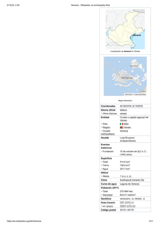 Venecia es una ciudad ubicada en el noreste de Italia, construida sobre 118 islas en la laguna de Venecia. Fue fundada en el siglo V y se desarrolló como una potencia comercial que dominó el comercio mediterráneo durante siglos. Venecia posee un gran patrimonio artístico y cultural fruto de su historia milenaria, siendo declarada Patrimonio de la Humanidad por la UNESCO.
