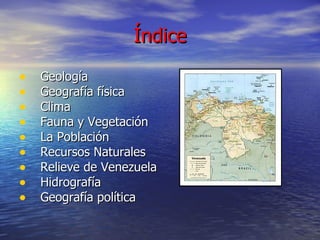Venezuela tiene una gran variedad de formas de relieve que incluyen los Andes, la Cordillera de la Costa, las Guayanas, mesetas de Tepuyes y la Gran Sabana. El país tiene un clima generalmente cálido y lluvioso que varía según la altitud, desde tropical hasta helado. Venezuela alberga una gran diversidad de fauna y flora, y el Orinoco es uno de los ríos más grandes e importantes del mundo.