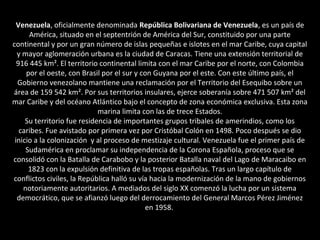 Venezuela es un país de América del Sur con una economía basada en el petróleo. Tiene una superficie de 916,445 km2 y una población de más de 29 millones de habitantes. La capital y ciudad más grande es Caracas, ubicada en la costa norte. Venezuela declaró su independencia de España en 1811 y ha experimentado períodos de crecimiento económico y crisis a lo largo de su historia.