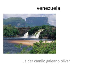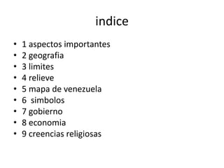 Este documento proporciona información sobre Venezuela. Resume los principales aspectos geográficos, como su ubicación en el norte de Sudamérica, sus límites con Colombia, Brasil, Guyana y el Mar Caribe, y su relieve diverso. También describe brevemente la economía basada en la exportación de petróleo y las principales creencias religiosas del país, que son predominantemente católicas.