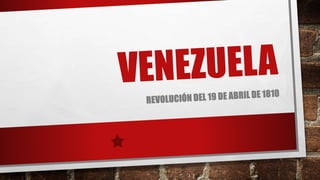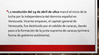 La revolución del 19 de abril de 1810 inició la lucha por la independencia de Venezuela del dominio español. Se formó la Junta Suprema de Caracas y el primer congreso nacional, hasta que finalmente se firmó la declaración de independencia el 5 de julio de 1811. Luego se establecieron varias juntas de gobierno en provincias y se tomaron iniciativas como liberar el comercio exterior y prohibir el comercio de esclavos.