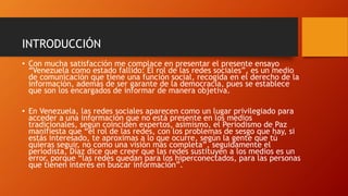 Las redes sociales en Venezuela proveen información a una élite hiperinformada y han desempeñado un papel clave en las manifestaciones de la oposición. Mientras que la oposición las usa para organizarse, el gobierno las acusa de propagar desinformación.