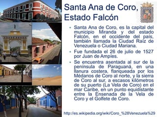 Santa Ana de Coro es la capital del municipio Miranda y del estado Falcón en Venezuela, conocida como la ciudad raíz de Venezuela. Fundada el 26 de julio de 1527 por Juan de Ampíes, se ubica en una llanura costera y cerca del puerto La Vela de Coro. El documento menciona varios puntos de interés, como la Catedral de Coro y el Parque ‘El Cardinalito’.