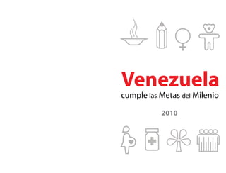 Este documento resume los logros de Venezuela en cumplir las Metas del Milenio para el año 2010. Explica que Venezuela asumió los Objetivos de Desarrollo del Milenio en el año 2000 comprometiéndose a erradicar la pobreza y mejorar las condiciones de vida. Luego detalla que gracias a las políticas sociales implementadas por el gobierno bolivariano desde 1999, Venezuela sobrecumplió la meta de reducir la pobreza extrema antes del plazo establecido por la ONU, disminuyendo la pobreza extrema