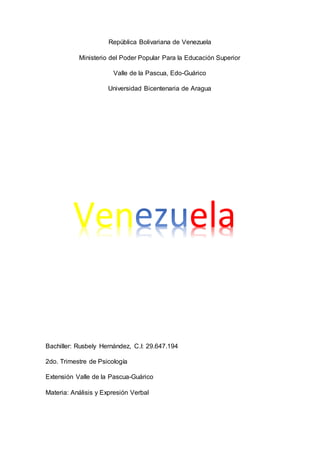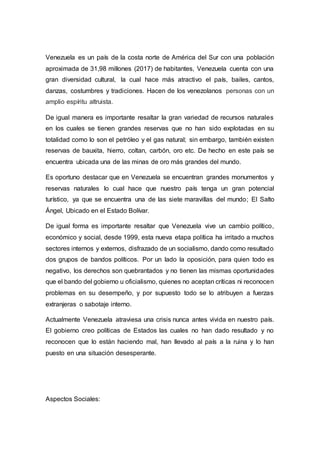 El documento resume la situación actual de Venezuela. Describe la economía en ruinas, la hiperinflación, la escasez de alimentos y medicinas, y la pobreza y hambre generalizadas que enfrenta el país. También detalla la crisis en los sectores de empleo, salud, educación y servicios básicos. La crisis multidimensional ha tenido graves consecuencias psicosociales para los venezolanos, incluida la depresión y el aumento de la emigración.