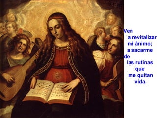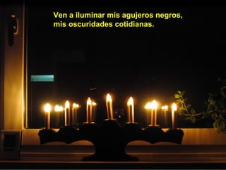 El documento es una oración dirigida a Dios en la que la persona le pide que venga a iluminar sus oscuridades, revitalizar su ánimo, y liberarlo de las ataduras para que pueda ayudar a los demás y vivir feliz. También le pide que sane lo que está enfermo dentro de él y llene su vida de sentido, serenidad y paz.