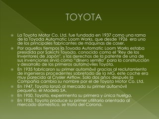 La empresa Toyota Motor Co. Ltd. fue fundada en 1937 y se ha convertido en uno de los mayores fabricantes de automóviles del mundo, produciendo más de 4.5 millones de vehículos al año. Suzuki Motor Corporation comenzó como un fabricante de maquinaria textil en 1909 antes de comenzar a producir automóviles en 1955 como una forma de diversificarse, y ahora vende vehículos en todo el mundo. El documento proporciona una historia detallada del establecimiento y el crecimiento de estas dos importantes compañías automotrices japonesas.
