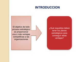 Este documento describe las ventajas competitivas y cómo las organizaciones pueden desarrollarlas a través de la cadena de valor. Las ventajas competitivas son capacidades fundamentales que colocan a una organización por encima de sus competidores. Para ser efectivas, las estrategias deben explotar estas ventajas de manera duradera. La cadena de valor analiza las actividades internas de una organización para determinar cómo agregar valor a los clientes.