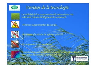 El documento describe las ventajas de la tecnología de láminas filtrantes para el tratamiento de aguas residuales. Ofrece operación desatendida con costos de mantenimiento insignificantes, procesos aerobios sin malos olores, y cortos retiros de la propiedad. Además, no requiere adición de químicos, tiene componentes de vida indefinida, y puede tratar diversos tipos de agua residual con altas tasas de remoción de contaminantes. Es una tecnología ampliamente probada y de bajo costo en comparación con mé