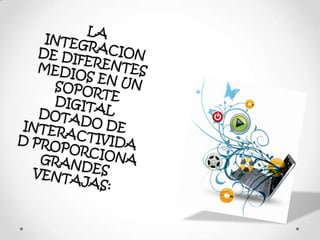 Este documento resume las ventajas y desventajas de la multimedia. Las ventajas incluyen que la información se presenta de manera completa e impactante debido al desarrollo de los medios digitales, está disponible las 24 horas del día, y los costos de actualización se reducen significativamente gracias al bajo costo del soporte digital. Algunas desventajas son que los costos de los equipos son altos, se necesita energía para que funcionen y algunos equipos tienden a generar adicción en su uso.