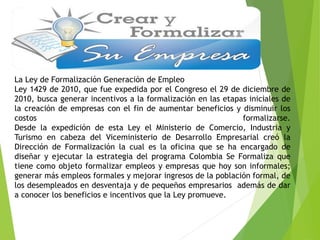 Este documento describe los pasos para formalizar una actividad comercial o crear una empresa en Colombia de acuerdo con la Ley de Formalización y Generación de Empleo 1429 de 2010. Explica cómo acceder a los beneficios de esta ley, los requisitos para formalizar un negocio, y los tipos de sociedades comerciales que se pueden constituir como persona natural o jurídica.