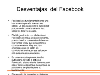 Facebook no es ideal para publicidad debido a que los usuarios no aceptan fácilmente la publicidad y requiere mucho esfuerzo mantener un diálogo relevante con los clientes. Además, las empresas tienen poco control sobre las campañas de Facebook ya que no controlan la plataforma.