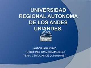 El documento describe 5 ventajas principales de Internet para las empresas: 1) elimina las limitaciones geográficas y permite atender clientes en todo el mundo, 2) permite el teletrabajo de manera más eficiente, 3) amplía los horizontes de ventas directas sin necesidad de un establecimiento físico, 4) facilita realizar operaciones financieras y trámites administrativos de manera online, y 5) permite a las empresas conocer a sus competidores y su oferta.