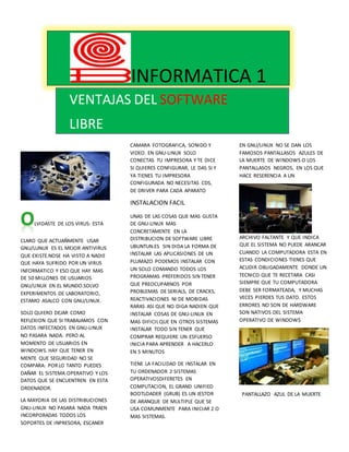 Este documento discute las ventajas de usar GNU/Linux en lugar de Windows desde una perspectiva de seguridad. Señala que GNU/Linux es más seguro porque no hay registros de usuarios afectados por virus de computadora, a diferencia de los 50 millones de usuarios de GNU/Linux. También menciona que la instalación de aplicaciones y hardware como impresoras, cámaras y más es más fácil en GNU/Linux sin necesidad de drivers.