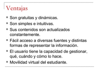 Este documento resume las ventajas e inconvenientes de las Web 2.0 en la educación. Las ventajas incluyen que son gratuitas, dinámicas, fáciles de actualizar y acceder, y permiten la colaboración y aprendizaje autónomo. Los inconvenientes son el acceso a información no apropiada, la pérdida del valor de las instituciones educativas, y que no siempre garantizan un aprendizaje efectivo. El documento concluye que a pesar de los desafíos, es importante utilizar las tecnologías en la educ