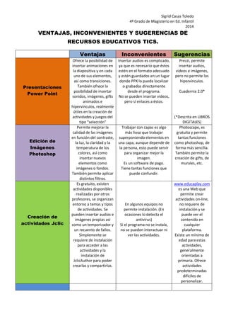 El documento describe las ventajas e inconvenientes de varios recursos educativos TIC como presentaciones PowerPoint, edición de imágenes con Photoshop, creación de actividades con Jclic, páginas web con FrontPage, edición de video con Nero, realidad aumentada, libros digitales, Cuadernia 2.0 y PDI. Se concluye que la PDI ofrece la mayor interactividad para los estudiantes al permitirles interactuar directamente con el contenido proyectado.