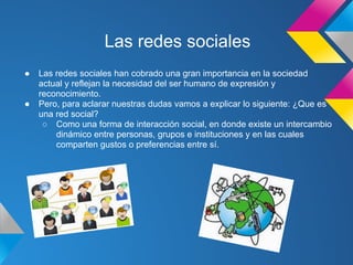 Este documento discute las ventajas y desventajas de las redes sociales. Entre las ventajas se encuentran la capacidad de conectarse con personas de todo el mundo, promocionar negocios, y compartir opiniones e información. Algunas desventajas incluyen el robo de identidad, la adicción, la falta de privacidad de datos, y su uso por criminales para contactar víctimas. El documento concluye recomendando usar las redes sociales de manera responsable y provechosa.