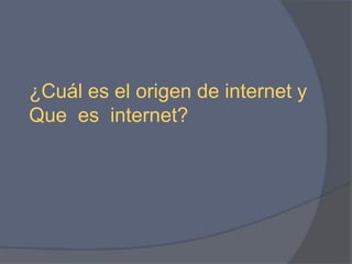 Internet es una red de redes que interconecta computadoras y redes de computadoras para compartir recursos. Tiene tanto ventajas como desventajas. Entre las ventajas se encuentra la capacidad de comunicarse y acceder a información desde cualquier lugar, mientras que entre las desventajas están la violación de privacidad, robo de identidad, y exposición a comentarios dañinos. Las redes sociales como Facebook y Twitter permiten interactuar con otros, pero también plantean riesgos como la falta de privacidad de datos y el contacto con desconocidos.