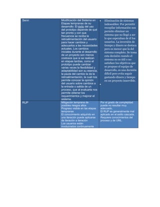 El documento compara diferentes ciclos de vida y modelos de desarrollo de software, describiendo sus ventajas y desventajas. El modelo cascada se caracteriza por una mejor definición de requerimientos y control del proceso de desarrollo, pero puede faltar revisión. El modelo en espiral utiliza control de riesgos pero puede llevar mucho tiempo. Los modelos estructurado, Kendall y Kendall, Senn y RUP cada uno presentan ventajas como flexibilidad, entrega continua de valor y mitigación temprana de riesgos, pero también