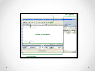 El documento describe la ventana de Dreamweaver, que es donde se crea y edita el contenido de las páginas web. La ventana de documento muestra el contenido aproximadamente como aparecerá en un navegador web. La barra de herramientas de documentos permite cambiar entre vistas y previsualizar la página. Los paneles flotantes pueden agruparse y ocultarse para optimizar el espacio de trabajo. El inspector de propiedades examina y edita las propiedades del elemento seleccionado. La barra de inserción incluye botones para agregar diferentes