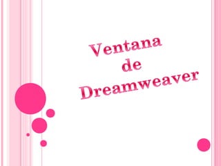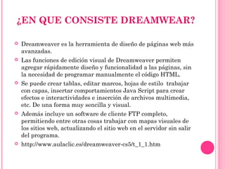 Dreamweaver es una herramienta para diseño y desarrollo web que permite crear y editar páginas de forma visual sin necesidad de programar código HTML a mano. Ofrece funciones para agregar diseño, tablas, hojas de estilo, efectos JavaScript, archivos multimedia e incluye capacidades de FTP para publicar sitios web.