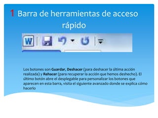 Este documento describe las principales herramientas y funciones de la interfaz de usuario de Microsoft Word. Incluye la barra de herramientas de acceso rápido, la barra de título, las pestañas de la cinta de opciones que contienen herramientas lógicas organizadas, las cintas de opciones de cada pestaña que permiten cambiar formatos de texto, los botones de ayuda, presentación, minimizar, maximizar y cerrar, las barras de desplazamiento vertical y horizontal, las opciones de zoom, las vistas del documento como vista de