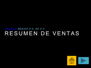 Este resumen de ventas describe los resultados de ventas de Privialia México S.A. de C.V. para el semestre primavera-verano de 2014. A pesar de la recesión económica, la compañía logró ventas por 339 millones de pesos, aunque menos que los 402 millones del año anterior. La campaña Ellas representó casi la mitad de las ventas totales. Las ventas fueron mayores en enero, febrero y marzo que en abril, mayo y junio.