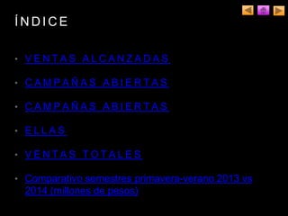 El resumen de ventas de Privialia México S.A. de C.V. muestra que a pesar de la recesión económica lograron alcanzar 339 millones de pesos en ventas, aunque es menor a los 402 millones del año anterior. La campaña Ellas representó casi el 50% de las ventas del semestre con 229 millones, mientras que la campaña Hogar obtuvo la segunda mayor venta con 79 millones. Las ventas totales de enero a junio de 2014 fueron menores en cada mes en comparación con el mismo periodo del año pasado
