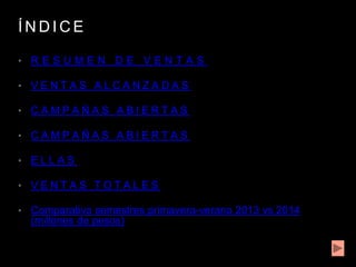 El resumen presenta las ventas alcanzadas por Privialia México S.A. de C.V. durante el semestre primavera-verano 2014. A pesar de la recesión económica, lograron 339 millones de pesos frente a los 402 millones del año anterior. La campaña Ellas representó casi la mitad de las ventas, mientras que Ellos, Sugar Garden y Hogar fueron las otras principales campañas. Las ventas totales fueron mayores en enero, febrero y marzo en comparación con el mismo periodo del año pasado.