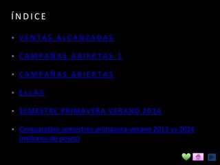 Este resumen de ventas muestra que la empresa Privialia México S.A. de C.V. alcanzó ventas por 339 millones de pesos en el semestre primavera-verano 2014, a pesar de la recesión económica. La campaña Ellas representó casi el 50% de las ventas totales, mientras que las campañas Hogar y Diseño Divino representaron el 16% y 9% respectivamente. Se sugiere aumentar el número de productos ofrecidos en la campaña Ellas para el próximo año.